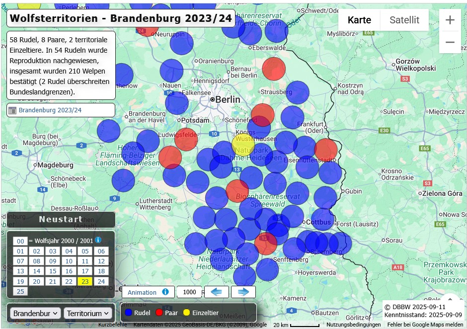 Das eine ist, dass der Bestand „gesättigt“ ist und die Wolfologie darüber froh und glücklich sein mag. Es muss aber die Frage erlaubt sein, ob und wie lange ein Wolfsbestand auf dieser Fläche, brutto 4.507 km², netto Vegetationsfläche 3.669 km², sattwerden kann, ohne das Ökosystem und die Weidetierhaltung nachhaltig zu schädigen. Für den aktuellen Bestand von 28 Territorien verbleiben rechnerisch je 131 km², wobei sich Wölfe nicht wie Wasser gleichmäßig auf einer ebenen Fläche verteilen. Die Abbildung der Territorien auf den dazu veröffentlichten Karten zur spricht Bände: