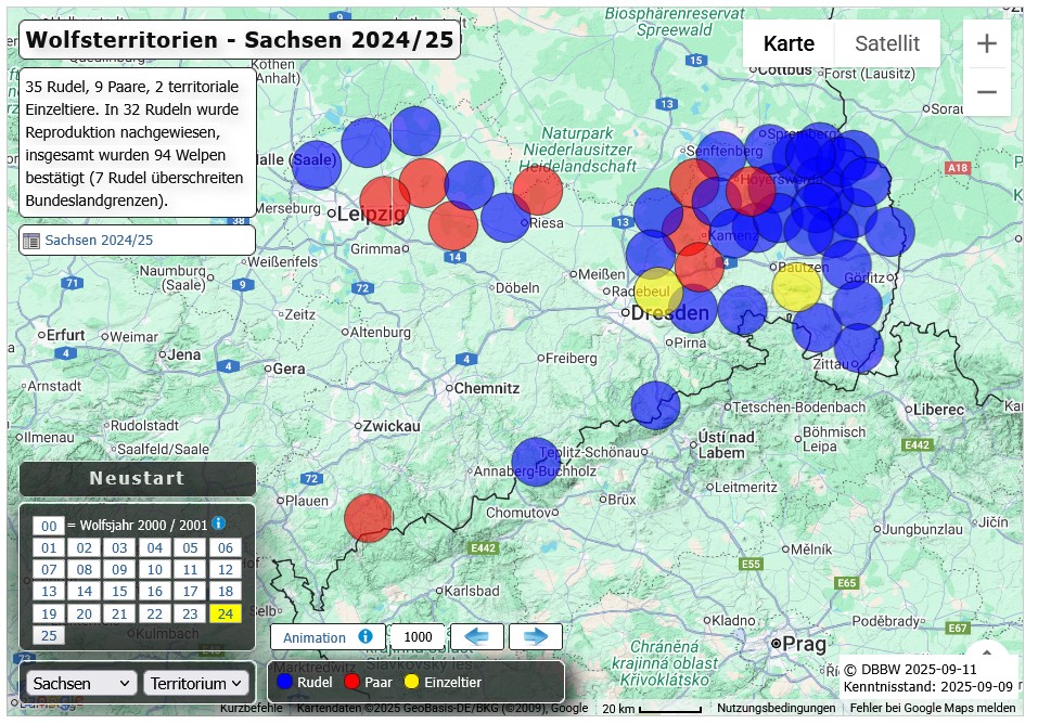 Von den 41 in Sachsen im vergangenen Monitoringjahr nachgewiesenen Territorien mit unterschiedlichem und teilweise noch nicht gesichertem Status werden 28 nach Ostsachsen, sprich in den Landkreise Bautzen und Görlitz verortet.
